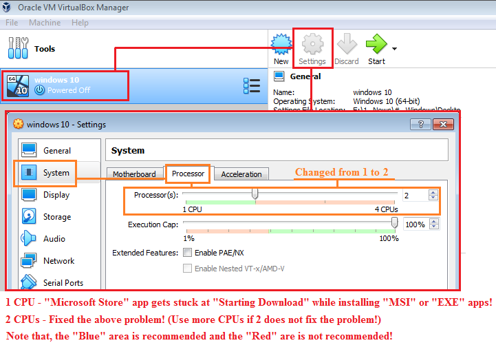 Virtual machines software like VirtualBox use by default only 1 CPU core, which may cause all kind of problems we can and can't imagine, including "Microsoft Store" app getting stuck at "Starting Download" while installing "MSI" or "EXE" apps!